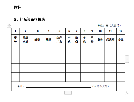 3、本项目设备清单补充COD国标回流仪、纯水机、紫外可见光光度计、BOD测定仪、涡轮传动法兰式蝶阀、柔性橡胶接头等设备(具体内容以邮件形式发送至已获取招标文件的潜在投标人提供的邮箱),补充内容包含在此次报价内。投标人应根据附件“5、补充设备报价表”格式(后附)将相应报价增加在本项目招标文件第六章 投标文件格式“六、分项报价表”内。