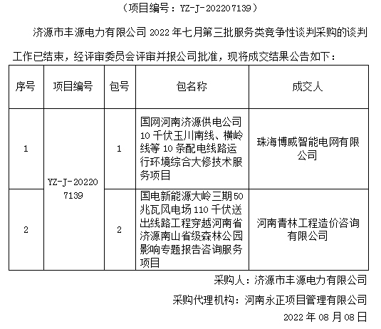 济源市丰源电力有限公司2022年七月第三批服务类竞争性谈判采购成交结果公告