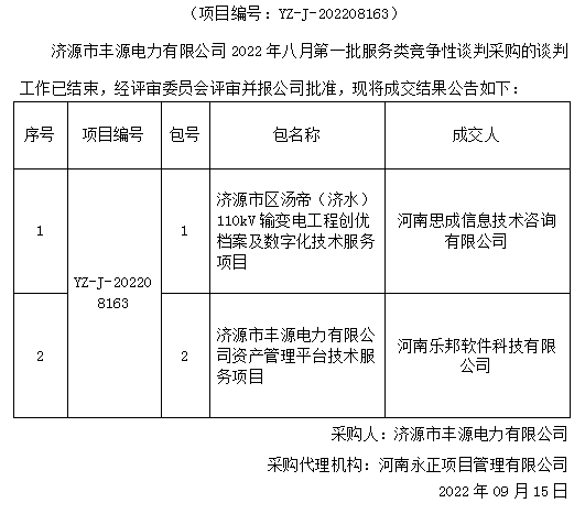 济源市丰源电力有限公司2022年八月第一批服务类竞争性谈判采购成交结果公告