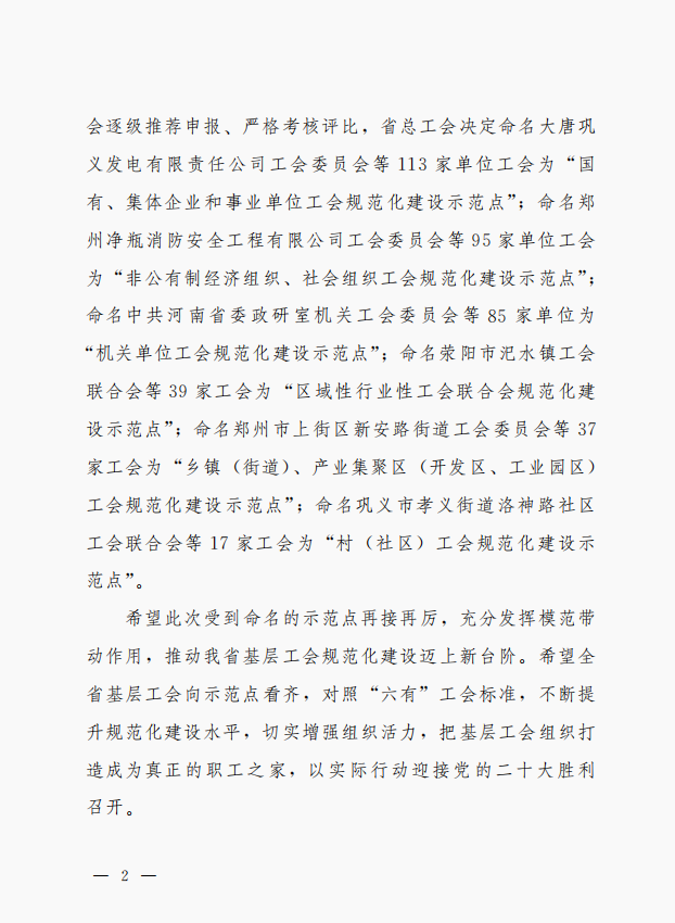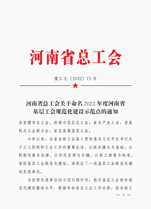 拼搏在线首页工会委员会被河南省总工会命名为“2022年度河南省基层工会规范化建设示范点”