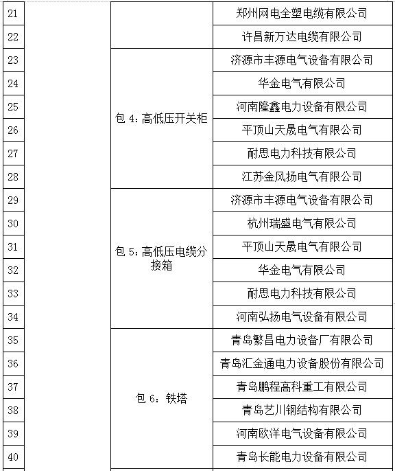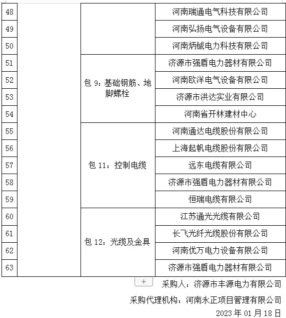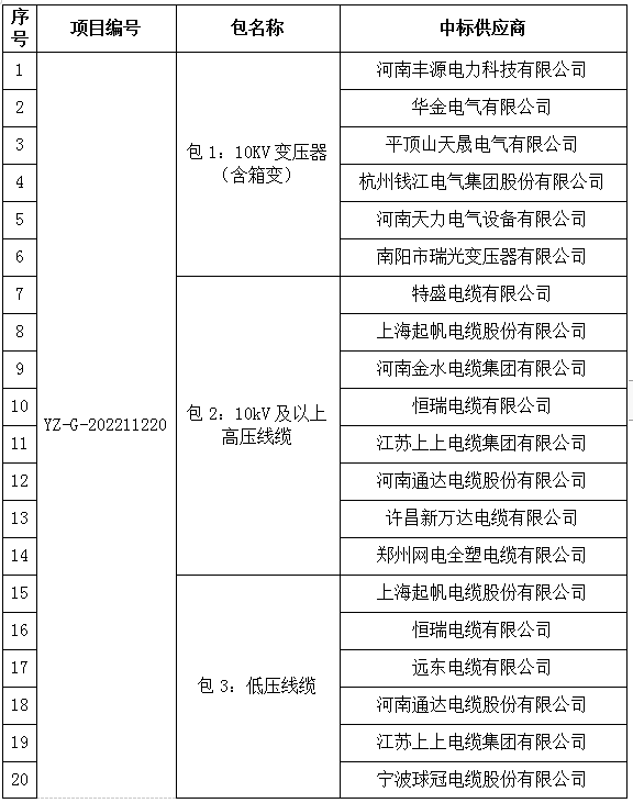 济源市丰源电力有限公司2023年物资框架入围项目的评标工作已结束,经评标委员会评审并报公司批准,现将中标结果公告如下: