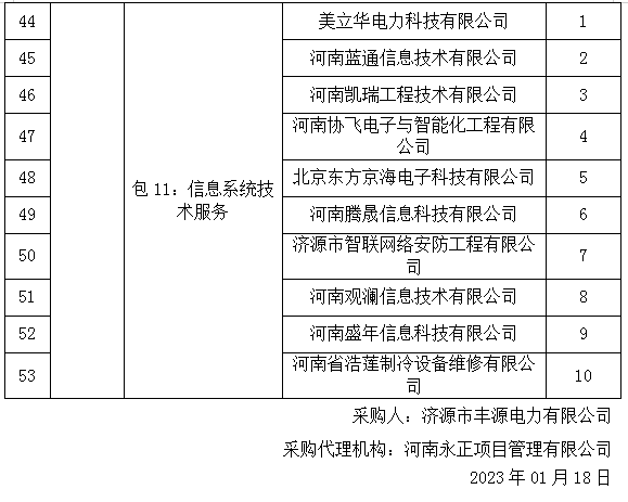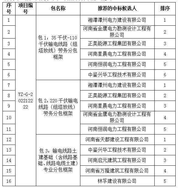 济源市丰源电力有限公司2023年施工供应商框架入围项目的评标工作已结束,依据《中标人民共和国招标投标法实施条例》、《招标公告和公示信息发布管理办法》和本项目招标文件对中标候选人公示的规定,现将评标委员会推荐的中标候选人予以公示,公示期3日。投标人或者其他利害关系人若对评标结果有异议的,请在中标候选人公示期间以书面形式提出。