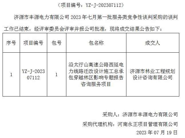 济源市丰源电力有限公司2023年七月第一批服务类竞争性谈判采购成交结果公告